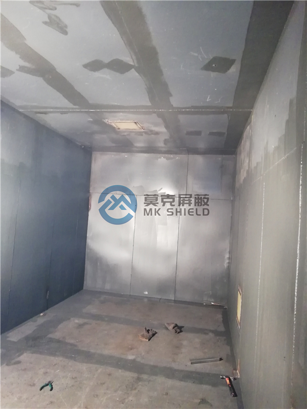 电磁屏蔽机房屏蔽壳体墙面、顶面采用厚度为2mm的优质冷轧板,地面采用厚度为3mm的优质冷轧板,铺设在用矩形管龙骨制作的屏蔽层支撑框架上,现场安装采用二氧化碳气体保护焊接固定,机房底部与地面间采用5mm高强度绝缘板作防潮绝缘处理,顶部作刚度加强处理.如楼面承重不够,应制作承重散力架,确保机房使用安全。整个屏蔽体作防腐油漆处理。
