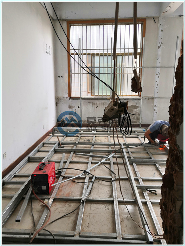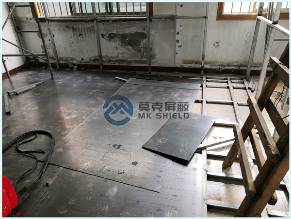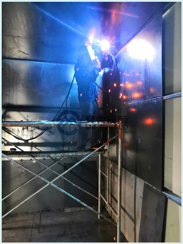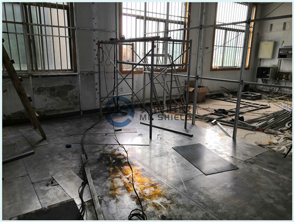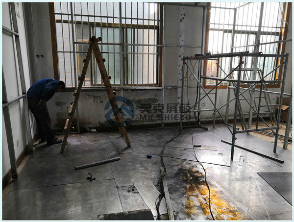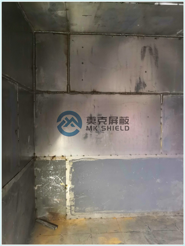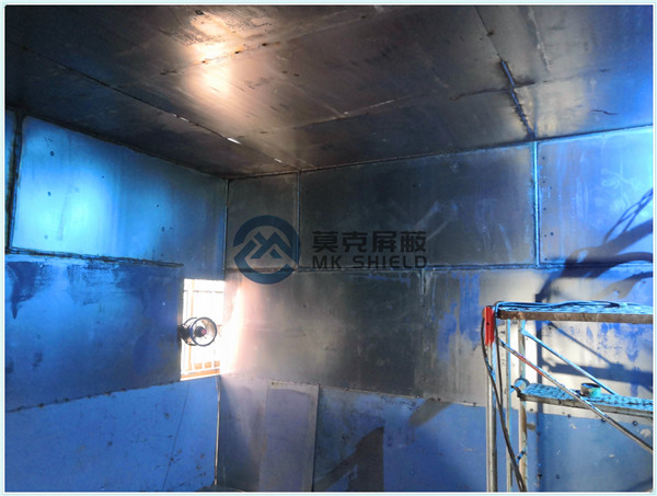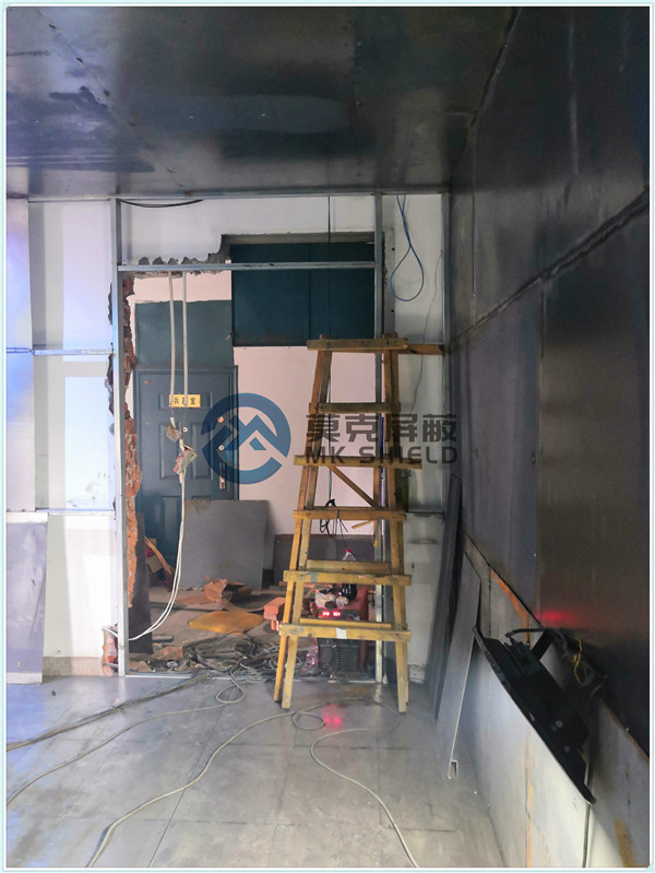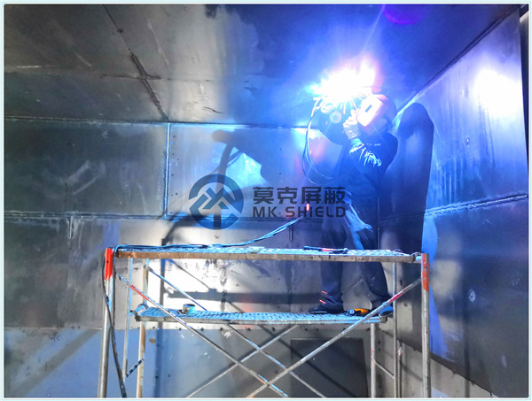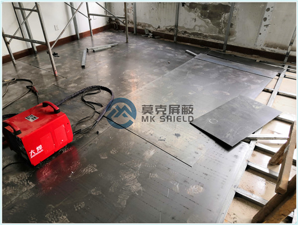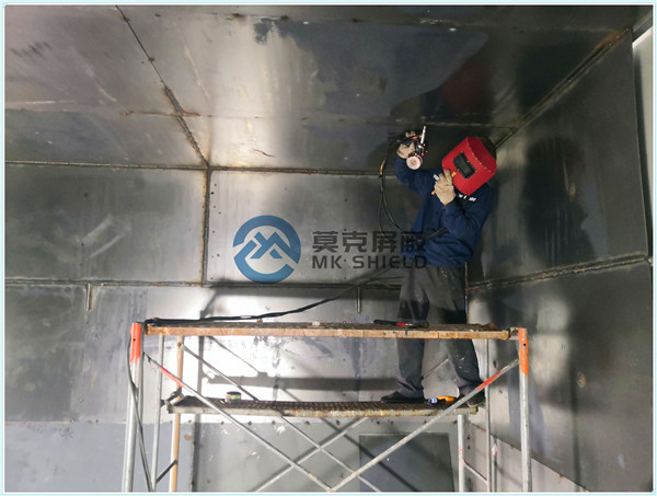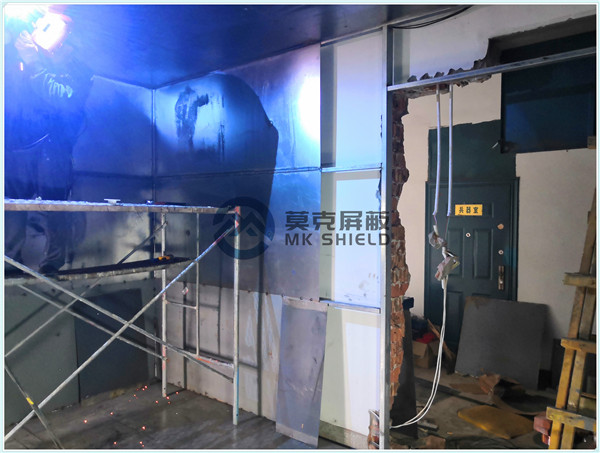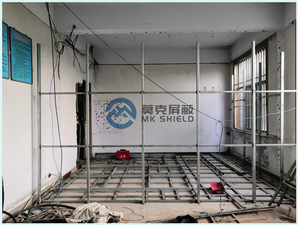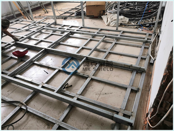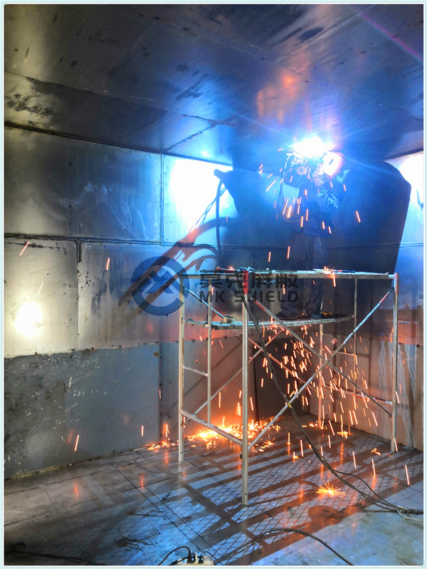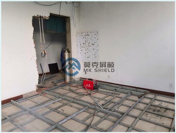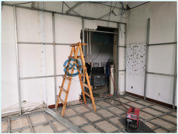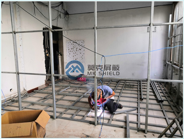 电磁屏蔽机房屏蔽壳体墙面、顶面采用厚度为2mm的优质冷轧板,地面采用厚度为3mm的优质冷轧板,铺设在用矩形管龙骨制作的屏蔽层支撑框架上,现场安装采用二氧化碳气体保护焊接固定,机房底部与地面间采用5mm高强度绝缘板作防潮绝缘处理,顶部作刚度加强处理.如楼面承重不够,应制作承重散力架,确保机房使用安全。整个屏蔽体作防腐油漆处理。