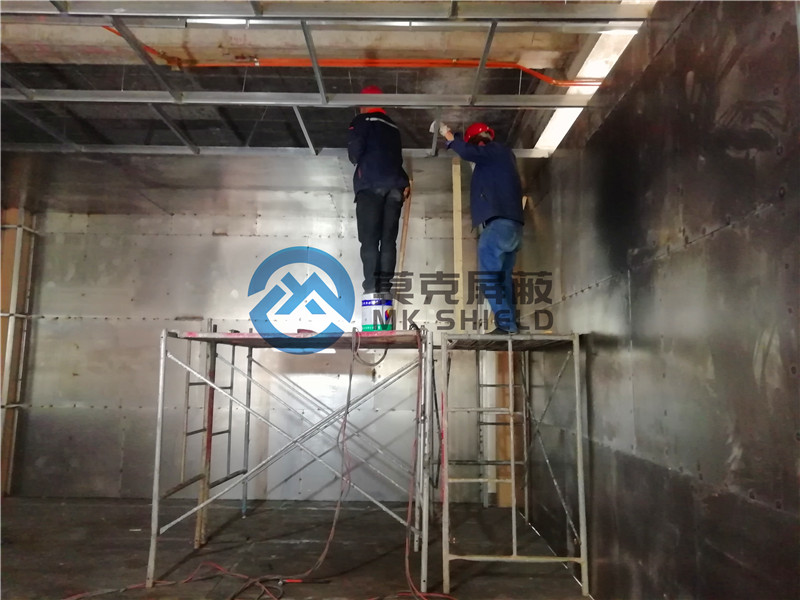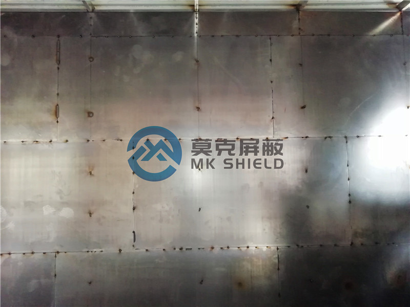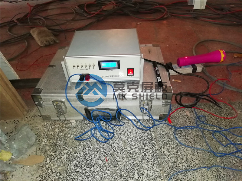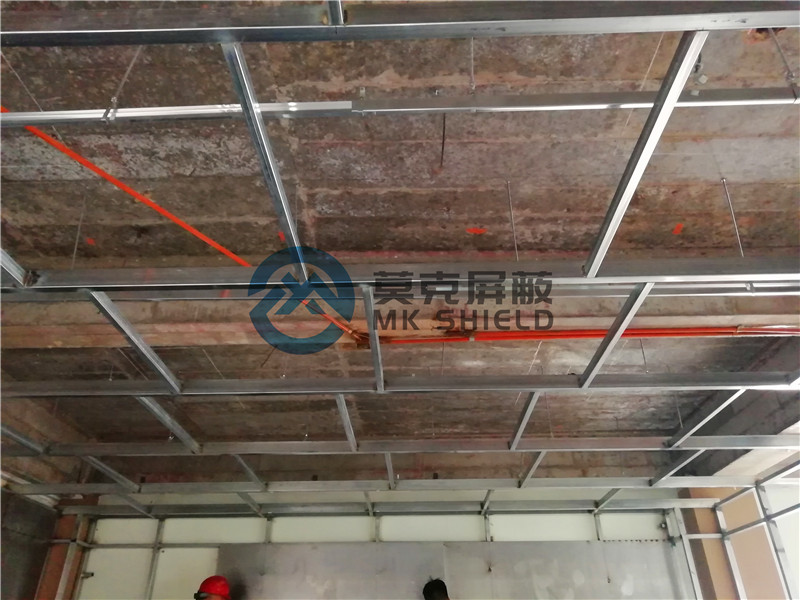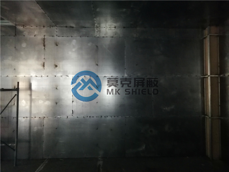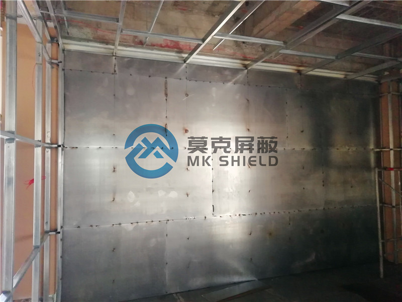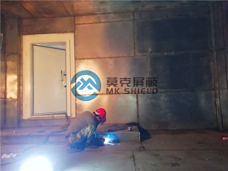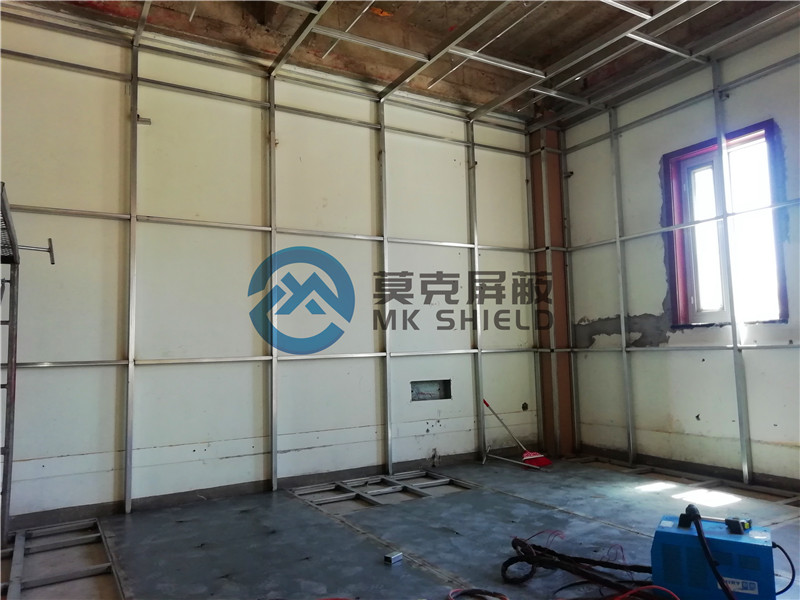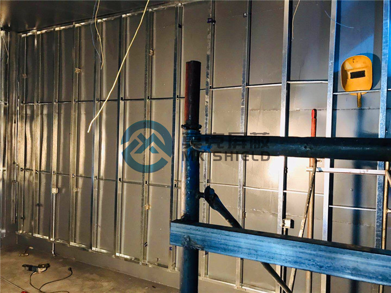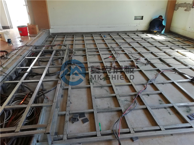电磁屏蔽机房屏蔽壳体墙面、顶面采用厚度为2mm的优质冷轧板,地面采用厚度为3mm的优质冷轧板,铺设在用矩形管龙骨制作的屏蔽层支撑框架上,现场安装采用二氧化碳气体保护焊接固定,机房底部与地面间采用5mm高强度绝缘板作防潮绝缘处理,顶部作刚度加强处理.如楼面承重不够,应制作承重散力架,确保机房使用安全。整个屏蔽体作防腐油漆处理。